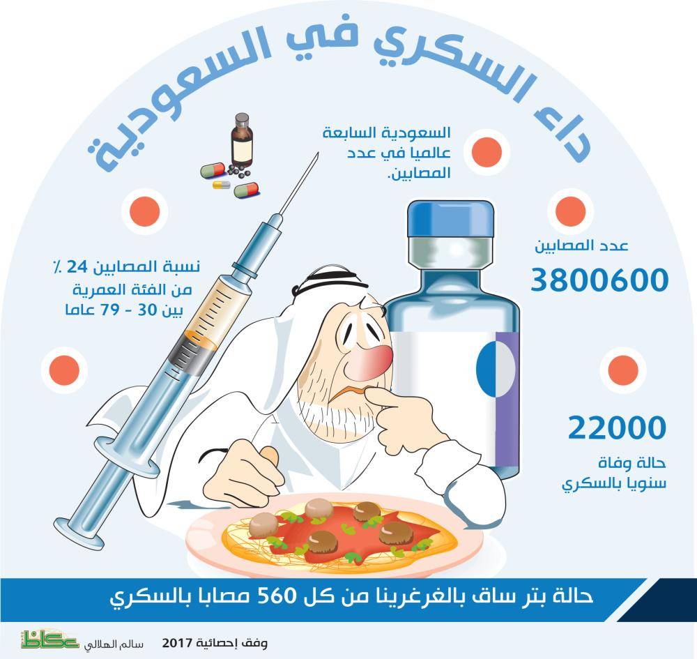 وذكر الدكتور طارق ناصر رئيس اللجنة المنظمة لمؤتمر مستجدات علاج السكري ومضاعفاته الذي عقد في جدة أخيرا، أن مرض السكري أخذ بالانتشار الملحوظ في العالم بمعدل تشخيص حالتين كل 10 ثوان، حيث بلغ عدد المصابين 415 مليون مصاب في العالم وسيزداد الرقم إلى 642 مليون مصاب عام 2040. وبلغت الوفيات عام 2017 أكثر من 5 ملايين شخص، بمعدل وفاة واحدة كل 6 ثوان، ومعدل وفيات مضاعفات السكري المتمثلة في تصلب الشرايين والجلطات القلبية والدماغية والفشل الكلوي تفوق معدل الوفيات الناتجة عن أمراض الإيدز والسل والملاريا، وصنفت المملكة ضمن الـ10 الأوائل عالمياً التي ينتشر فيها السكري، إذ تحتل المركز السابع عالمياً بنسبة انتشار بلغت 24% في الفئة العمرية 30- 79 عاما، إذ يقّدر عدد المصابين بداء السكري 3.800.600 مصاب عام ٢٠١٧، ويقدر الاتحاد الفيدرالي العالمي للسكري معدل الوفيات بسبب السكري في المملكة بأكثر من 22 ألف وفاة سنوياً.