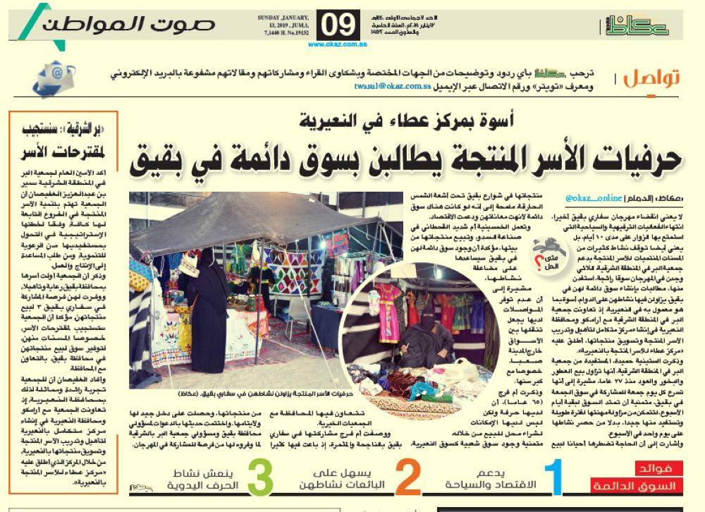 وكانت «عكاظ» نشرت تقريرا بعد انقضاء مهرجان سفاري بقيق أخيرا، نقلت فيه مطالب كثير من المنتميات للأسر المنتجة بإنشاء سوق دائمة لهن في بقيق، يزاولن فيها نشاطهن على الدوام، أسوة بما هو معمول به في النعيرية، إذ تعاونت جمعية البر في المنطقة الشرقية مع أرامكو ومحافظة النعيرية في إنشاء مركز متكامل لتأهيل وتدريب الأسر المنتجة وتسويق منتجاتها، أطلق عليه «مركز عطاء للأسر المنتجة بالنعيرية».