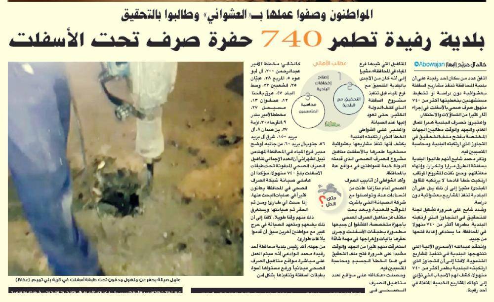 وكانت «عكاظ» نقلت شكوى سكان أحد رفيدة من أن بلدية المحافظة تنفذ مشاريع السفلتة بعشوائية دون دراسة أو تخطيط، مستشهدين بتغطيتها أكثر من 740 منهل صرف صحي بالأسفلت، في إجراء أثار كثيرا من التساؤلات والاستنكار.