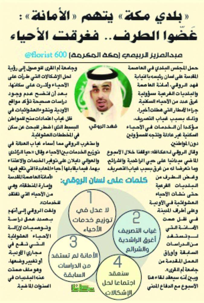 وكانت «عكاظ» نشرت تصريحا لرئيس المجلس البلدي في العاصمة المقدسة بالنيابة فهد الروقي حمّل فيه أمانة العاصمة المقدسة والبلديات الفرعية مسؤولية غرق عدد من الأحياء جراء هطول الأمطار، بسبب غياب التصريف، مؤكدا أن الخدمات في الأحياء السكنية غير عادلة وتتجه للمسؤولين دون المواطنين. وقال الروقي لـ«عكاظ»: «وقفنا خلال الأسبوع الماضي -ميدانيا- على حيي الراشدية والشرائع، وما تعرضا له من غرق بسبب غياب التصريف، وغض الطرف من البلديات الفرعية حتى نشأت الأحياء العشوائية في الأودية وعلى أطراف المدينة، في ظل صمت الأمانة التي لم تستفد من الدراسات السابقة وأوراق العمل المقدمة من جامعة أم القرى». واستغرب الروقي مما سماه غياب العدالة في توزيع الخدمات بين الأحياء، وقال: «حيا الزائدي والعوالي دليلان على توفير الخدمات والاعتناء بهما، فيما تقابلهما أحياء المعابدة التي تقع فيها «أمانة العاصمة المقدسة وإمارة المنطقة»، وهي من الأحياء التي تفتقد الخدمات». ولفت الروقي إلى أنهم بصدد عمل دراسة وتوصيات لإزالة الأحياء العشوائية التي تقع في مجاري الأودية، أو تغيير وضعها، وهو ملف صمتت عنه البلديات في السنوات الماضية.