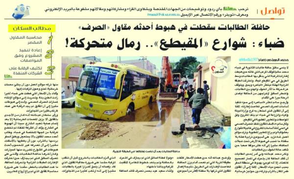 تفاعل فرع وزارة البيئة والمياه والزراعة في تبوك مع ما نشرته «عكاظ» بعنوان «ضباء: شوارع المقيطع.. رمال متحركة!» في (26/7/1440) حول سقوط حافلة للطالبات في حفريات مشروع الصرف الصحي المنفذ في حي المقيطع في ضباء، نتيجة هشاشة التنفيذ والاكتفاء بالطبقة الرملية في موقع المشروع دون سفلتة.