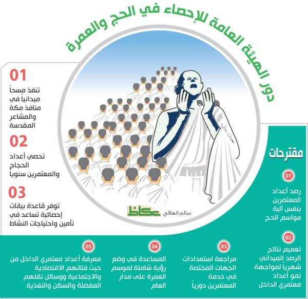 كما أن لهيئة الإحصاء حضورها في مجال العمرة، مثل المسح الذي تجريه لبيان أعداد المعتمرين سنوياً، والذي يحقق فوائد عدة؛ أهمها توفير قاعدة بيانات إحصائية دقيقة تساعد على تأمين احتياجات النشاط، خصوصا أن العمرة أصبحت من أهم عناصر تدفق الموارد المالية وعاملاً مهما من عوامل التنمية الاقتصادية الحقيقية، خصوصا أن الهيئة العامة للإحصاء لديها الموافقة لإجراء مثل هذه المهمة بموجب قرار مجلس الوزراء رقم 211 وتاريخ 13/1/1437هـ، والذي منحها الصلاحية لإجراء العمليات الإحصائية في المجالات الاقتصادية والاجتماعية والسكانية عن المملكة ونشرها بصفة دورية.