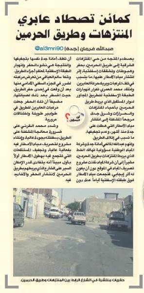 وكانت «عكاظ» نشرت تقريراً نقلت فيه معاناة العابرين من حي المنتزهات الشرقية إلى طريق الحرمين باصطدامهم بحفر وهبوطات وتشققات أسفلتية إثر انتشار مياه الأمطار عليها، ما يتسبب في تلف المركبات ويربك حركة السير.