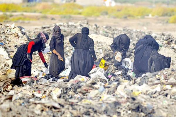 نساء يبحثن في مكبِّ نفايات في الديوانية جنوبي العاصمة العراقية.