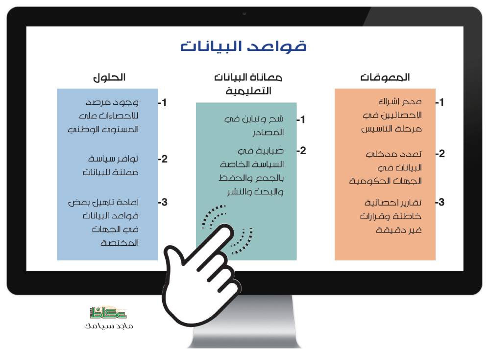 ويتطلب تحقيق ذلك وجود مرصد للإحصاءات سواء على المستوى الوطني أو الجهات المستهدفة، وسياسة معلنة للبيانات مع ضرورة إعادة تأهيل بعض قواعد البيانات التي تعاني بعض الجهات من مشاكل عدة، وأحد أهم مشاكل قواعد البيانات هي عدم إشراك الإحصائيين في مرحلة مبكرة من التأسيس، وعدم تنظيف البيانات وتعدد قواعدها ومدخلي البيانات في الجهات الحكومية، لذلك أي خلل في مراحل إدارة البيانات سيولد تقارير إحصائية خاطئة وقرارات غير دقيقة.