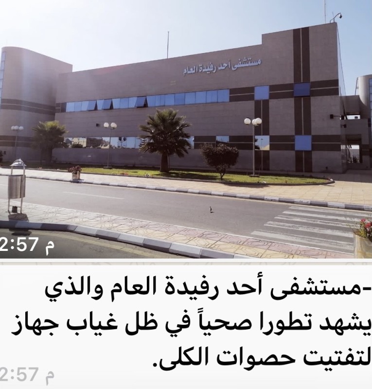 وقال فهد القحطاني إنه لا يوجد في عيادة المسالك البولية بمستشفى المحافظة، جهاز لتفتيت حصوات الكلى، وهذا الأمر يستدعي التعجب والحيرة على الرغم من التطور الكبير والهائل الذي يشهده المستشفى في مرفقاته، والإنجازات الطبية التي يحققها بشكل مستمر، إذ ينتظر مريض الحصوات الكلوية موعده بعد أسبوع أو أسبوعين ثم يُجري تحاليل معينة، ويعمل أشعة تلفزيونية، ثم ينتظر عدة أيام حتى يتم الإعلان عن النتائج، وعند إصابته بحصوات كلى، ينتظر أياماً حتى تتم الموافقة على تحويله إلى مستشفى آخر يتوافر فيه جهاز تفتيت حصوات الكلى، ومن المؤكد الانتظار في قائمة المرضى هناك، وهذا الإجراء يستغرق وقتاً طويلاً في ظل ما يعانيه المريض من آلام ولو قامت الجهة المختصة بتوفير الجهاز في مستشفى المحافظة، لانتهت معاناة مرضى الحصوات الكلوية، وتم علاج المصاب خلال وقت قصير.