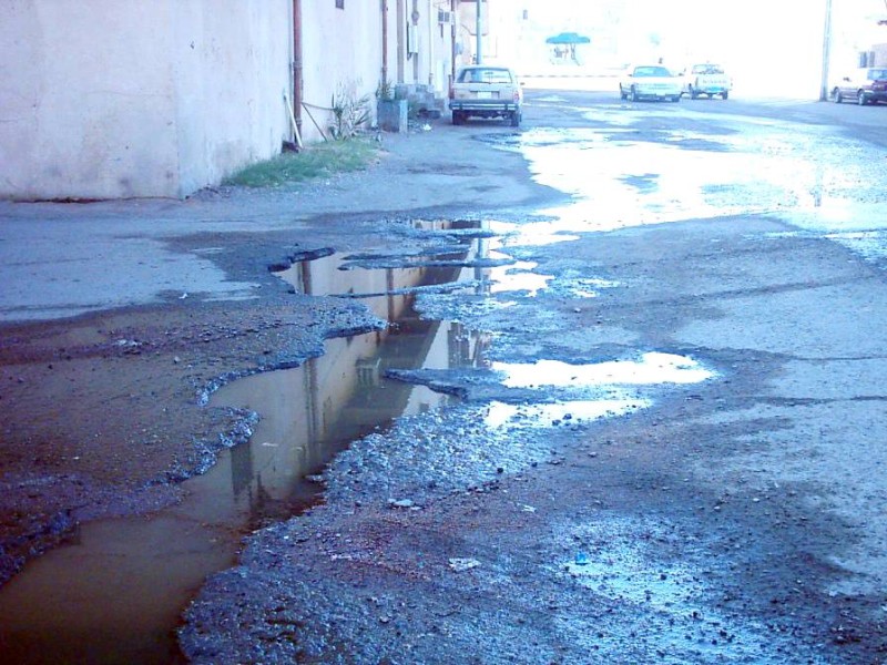 أسفلت متهالك بسبب المياه وبات يشكل خطرا على المارة والسيارات. (عكاظ)