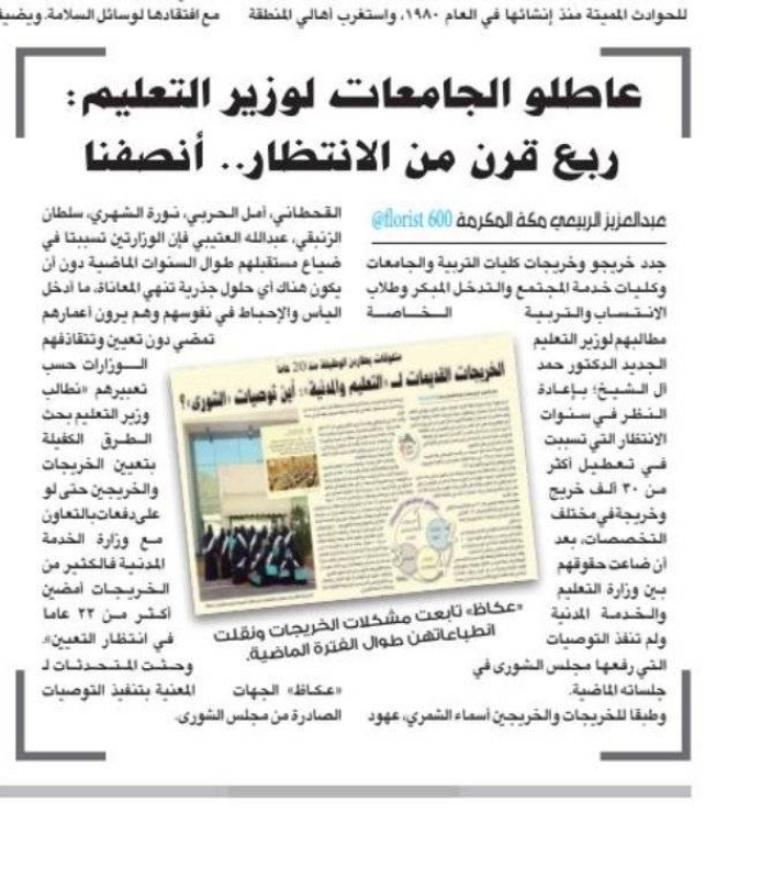 رغم مرور سنوات عديدة على خريجات كليات التربية وحصولهن على الدبلوم التربوي والتطبيق لفصل دراسي خلال دراستهن أربع سنوات وصدور توصيات مجلس الشورى، ما زالت رسالة «لا تتناسب الوظيفة مع مؤهلاتك» تطارد الخريجات كلما لاح أمامهن بريق أمل في وظائف شاغرة بالجهات المختلفة. وتستغرب الخريجات صمت الجهات المعنية دون البت في طلباتهن رغم الوعود التي قطعتها جهات عدة في وقت سابق. وترى الخريجات أم حسام ونوف العتيبي وأم جواد، أن الأمر يزداد تعقيدا وغموضا بسبب الصمت الذي يخيم على الجميع ليزداد الأمر سوءا مع اعتذار جهات التوظيف في القطاعات الحكومية «لا توجد وظائف تناسب درجاتك العلمية وتخصصك». واعتبرت الخريجات أن الوزارة امتصت غضبهن بالوعود المتكررة دون أن تظهر نتائج والوعود التي أعلنتها الوزارة أكثر من مرة، ويطالبن بإيقاف الوعود أو توظيفهن وتنفيذ توصيات مجلس الشورى، التي تنص على التنسيق بين وزارتي التعليم والموارد البشرية ومعاملة الخريجات أسوة بكليات المعلمات والمتوسطة، وبفتح احتساب نقاط الأقدمية التي توقفت عند 10 سنوات ولا تحسب لهن نقاط الأقدمية بعد السنوات الـ10 رغم تجاوز البعض منهن 15 سنة انتظار، وحصول بعضهن على النجاح في قياس والرخصة المهنية للتعليم.