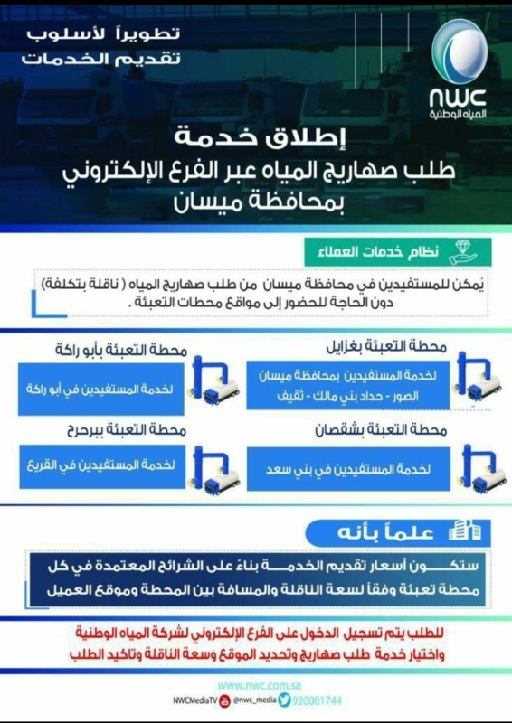 وبشأن أسعار الصهاريج أكدت الشركة أن لكل نطاق تعرفة ثابتة تعتمد على حجم الصهريج، والمسافة بين منطقة العميل ومحطة التعبئة، ويمكن للعميل التعرف على الأسعار المعتمدة بالتواصل مع قنوات الخدمة، وفي حالة التلاعب بالأسعار يتم تطبيق العقوبات والغرامات الصارمة على الصهريج المخالف. كما أن إنشاء محطة تعبئة بمحافظة ميسان يعتبر ضمن المخطط العام، وتم الانتهاء من دراسة المشروع واستلام الموقع، وسيتم البدء بالتنفيذ عند الانتهاء من الإجراءات الخاصة بذلك وتوفر الاعتمادات المالية اللازمة. ودعت الشركة جميع العملاء والمواطنين في حال وجود أي ملاحظة أو استفسار بالتواصل معها عبر الفرع الإلكتروني للشركة، أو عن طريق الرقم الموحد.