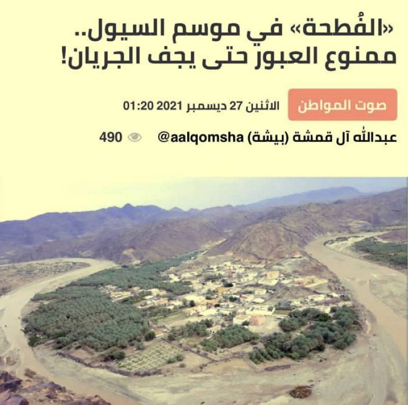 جاء ذلك تعقيباً على ما نشرته «عكاظ» في عددها الصادر يوم الإثنين 27 ديسمبر 2021 تحت عنوان «الفُطحة» في موسم السيول.. ممنوع العبور حتى يجف الجريان!