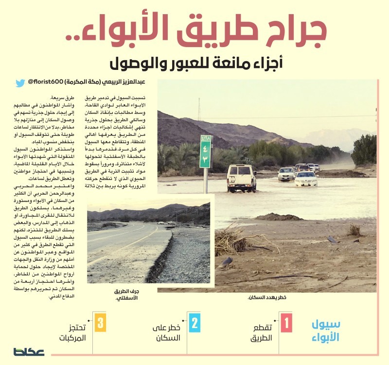 تعقيبا على ما نشر في الصحيفة في العدد رقم 20129 بتاريخ 15 جمادي الأولى تحت عنوان (جراح طريق الأبواء.. أجراء مانعة للعبور والوصول)، أوضح مدير إدارة الاتصال المؤسسي والإعلامي في أمانة محافظة جدة محمد البقمي، أن الموقع خارج الحيز العمراني المعتمد، وليس من اختصاص البلدية. وقال إنه في عام 2020، ومن خلال مشاريع درء أخطار السيول، تم تنفيذ مشروع درء الأخطار في رابغ وقراها بأكثر من 13 مليون ريال لقرية الأبواء، وشمل نطاق المشروع أربعة أحياء هي: التظيبية، السير، مرتج، والمطاريق، وذلك طبقا لتوصية سابقة من اللجان المشاركة للمناطق الأشد ضرراً.