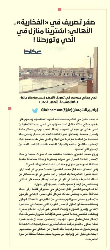 وكانت «عكاظ»، نشرت تقريرا نقلت فيه شكاوى عدد من أهالي الحي بعدما اكتشفوا سوء تصريف مياه الأمطار ما تسبب لهم في خسائر مالية وأضرار جسيمة بسبب ارتفاع منسوب المياه وتسربها إلى المنازل، مطالبين بوضع حلول حاسمة وعاجلة تنقذ السكان من المخاطر التي تحيط بهم.