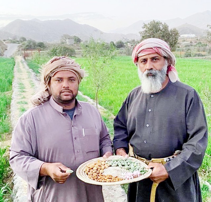 مزارعان في قرى بني مالك يعرضان منتجاتهما. (عكاظ)