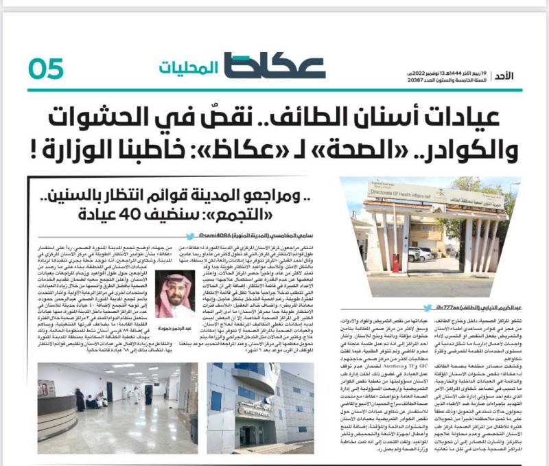 جاء ذلك رداً على استفسار «عكاظ» عن نقص الحشوات الدائمة والمؤقتة والكوادر الصحية بالعيادات.