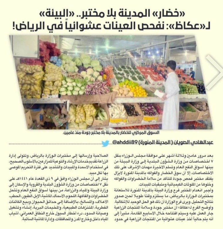 وكانت «عكاظ»، نشرت تقريراً عن انعدام مختبر فحص المنتجات الزراعية في سوق الخضار والفواكه رغم مرور عامين وثلاثة أشهر على موافقة مجلس الوزراء على نقل 7 اختصاصات من وزارة الشؤون البلدية إلى وزارة البيئة من بينها أسواق النفع العام، وتسلم الأخيرة مهمات الإشراف على تلك الاختصاصات، ما أجبر ذلك فرع وزارة البيئة بالمدينة على الاستعانة بمختبرات الوزارة بالرياض، ما يستلزم وقتاً طويلاً لحين صدور نتائج التحاليل.