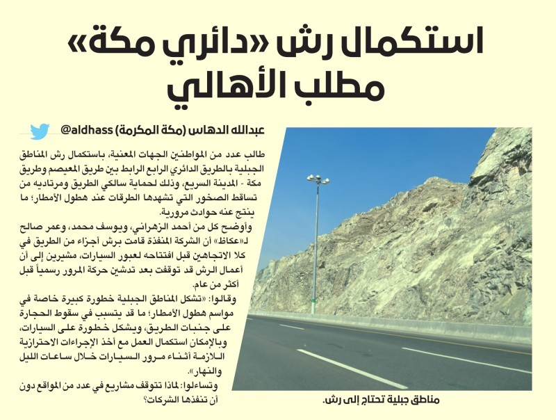 تعليقاً على ما نشرته «عكاظ» في يوم 15 /6/ 1444 بعنوان «استكمال رش دائري مكة مطلب الأهالي»، أبلغ مدير الاتصال المؤسسي في أمانة العاصمة المقدسة ممدوح الدهاسي «عكاظ»، أن الرشة الأسمنتية تتم على المواقع المطلة مباشرة على الطرق، وأن الموقع المذكور في التقرير لا يطل بشكل مباشر على الطريق، وتوجد مسافة بينهما ولا يشكل خطورة على المارة.