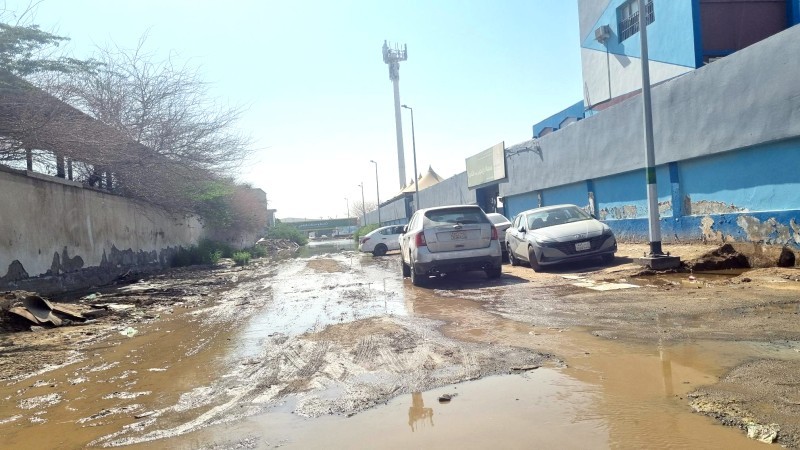 المياه تتجمع أمام ثانوية ابن حزم في بحرة. (عكاظ)