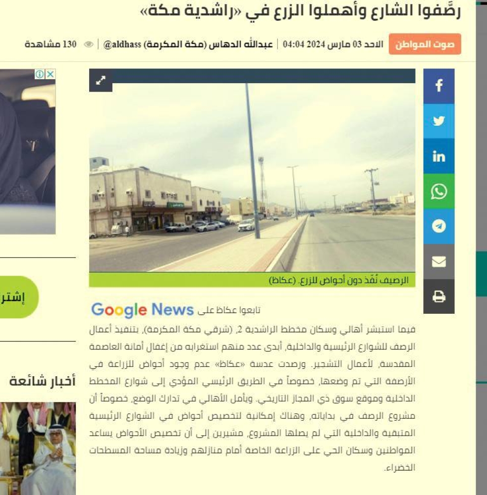تفاعلت أمانة العاصمة المقدسة؛ ممثلة في مدير عام الاتصال المؤسسي دانيا عبدالقادر التركستاني، مع تقرير «عكاظ» الذي نشر في 3/ 3/ 2024م، تحت عنوان «رصفوا الشارع وأهملوا الزرع في راشدية مكة».