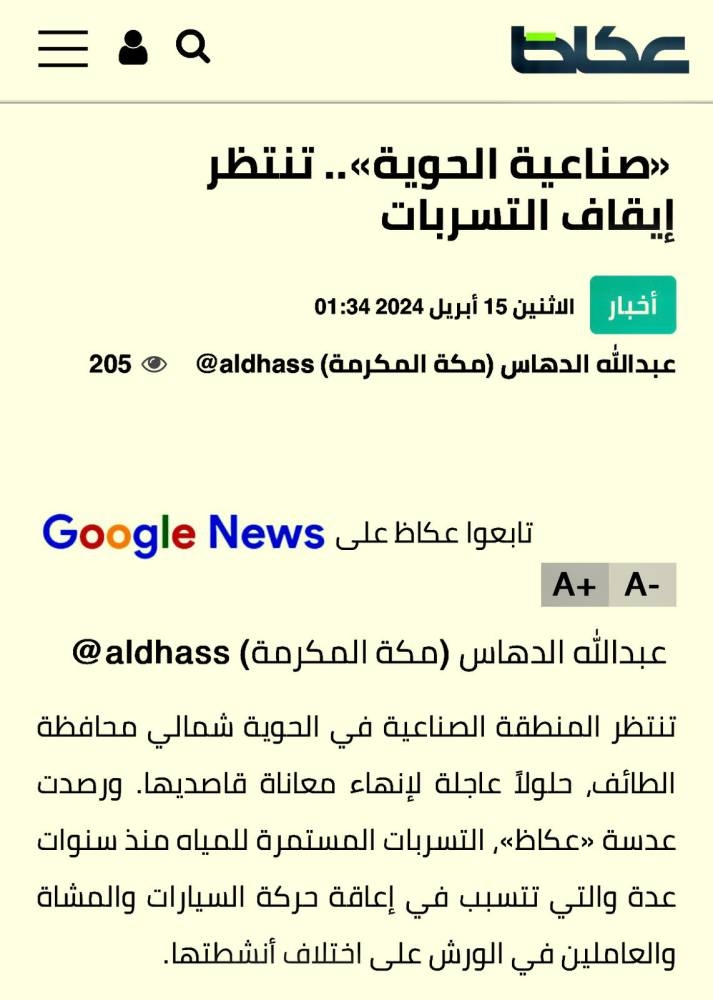 ضوئية لما نشر في «عكاظ» عن تسربات صناعية حوية الطائف.