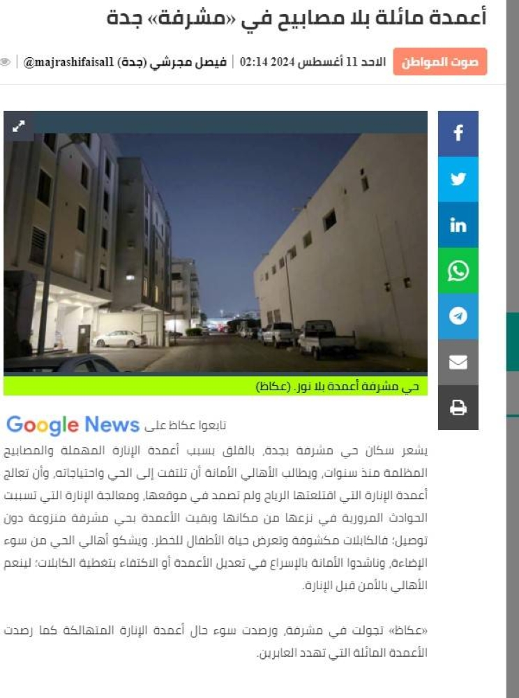 ضوئية لما نشر في عكاظ عن الانارة في حي مشرفة بجدة