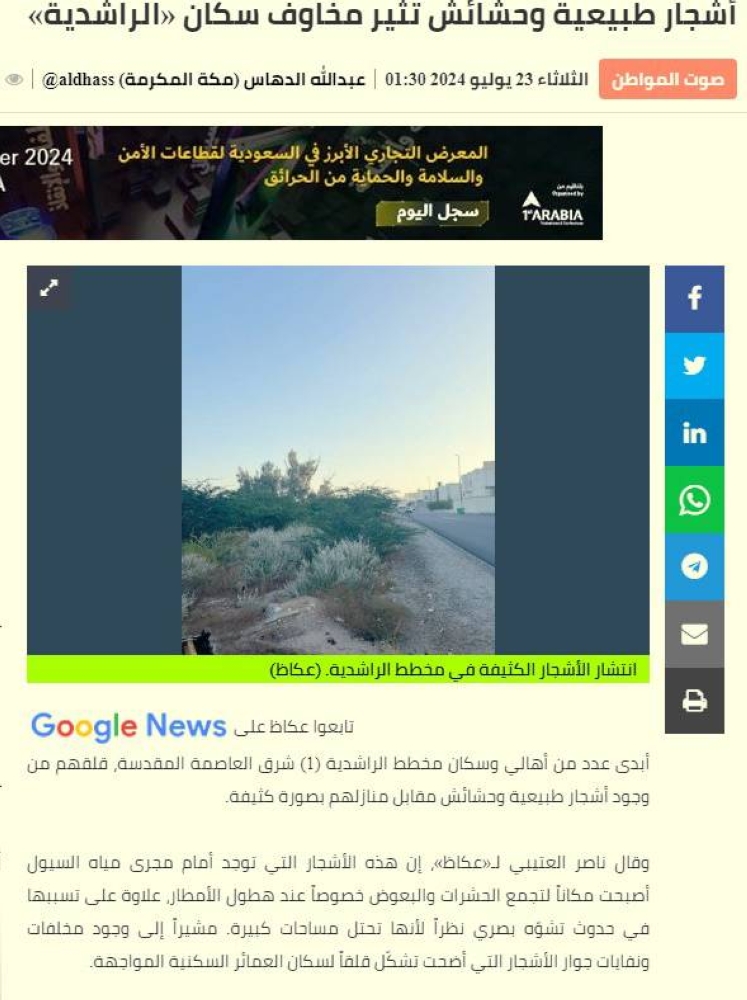 ضوئية لما نشر في «عكاظ» عن أشجار «الراشدية» بمكة المكرمة.