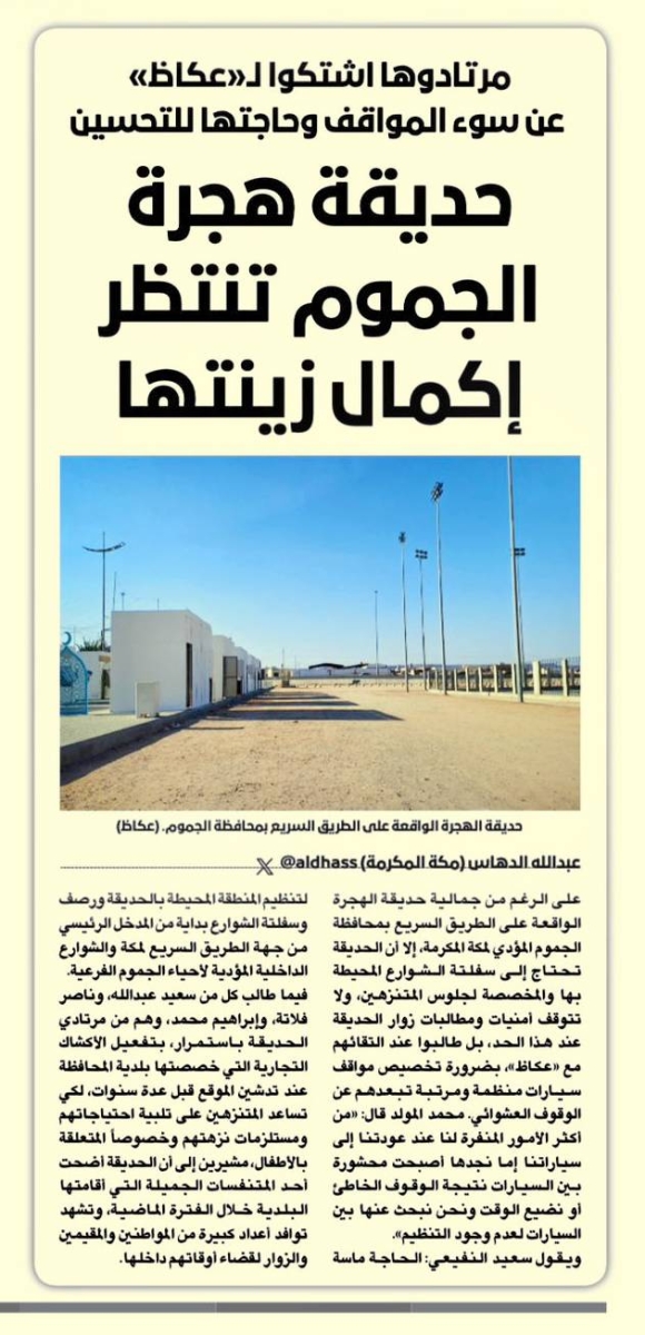 This came in response to what was published by "Okaz," regarding the observations related to Al-Hijrah Park in the governorate under the title (Al-Jamoum Hijrah Park Awaits the Completion of Its Beautification) which was published on Tuesday, August 5th of this month.
