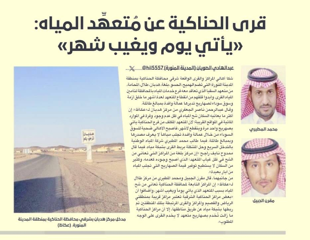 In response to what was published by "Okaz" regarding the suffering of the residents of the centers and villages located (east of Al-Hanakiyah Governorate), which include: Al-Hameej, Al-Hassu, Hadban, Balghah, Al-Mahamah, Talal, and Bathi, due to the contractor's interruption for several months in delivering water to them, creating a crisis and a black market for water tankers operated by foreign labor at exorbitant prices, exploiting the residents' need for water... This was in the issue published with the number 21267 under the title: "The villages of Al-Hanakiyah on the water contractor: 'A day comes, and a month goes'” in the issue dated 15 Safar 1447 AH, corresponding to September 7, 2025 AD. The National Water Company confirmed to "Okaz" that a new contractor has been hired to resolve the water crisis in those centers and villages, and all the mentioned centers and villages are now within the scope of the new water supply contract, which began providing service at the beginning of this week after completing the procedures for awarding the new contract.
