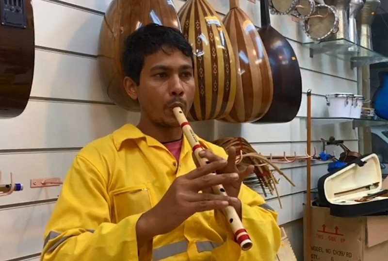 فإلى جانب «المقشة»، يحمل الأمين آلة العزف «الناي» التي أهداه إياها مالك أحد محلات بيع وصيانة الأدوات الموسيقية، ليمارس هوايته في العزف بعد انتهاء نوبته، بأنغام مصحوبة بالغناء بلغته وبعض العربية لنشيد مدح النبي صلى الله عليه وسلم، وهو كل ما كان يحمله من اللغة العربية عند قدومه من بلاده.