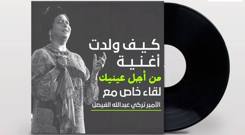 وأضاف: «بينما هي تتناول الغداء قالت: يا سمو الأمير ما عندك قصيدة أغنيها، فقام والدي وقدم لها 5 قصائد، وأخذتها وغادرت إلى مصر، وعند وصولها إلى بلدها قرأت القصائد وأخذت من كل قصيدة جزءاً، وكونت أغنية من أجل عينيك».