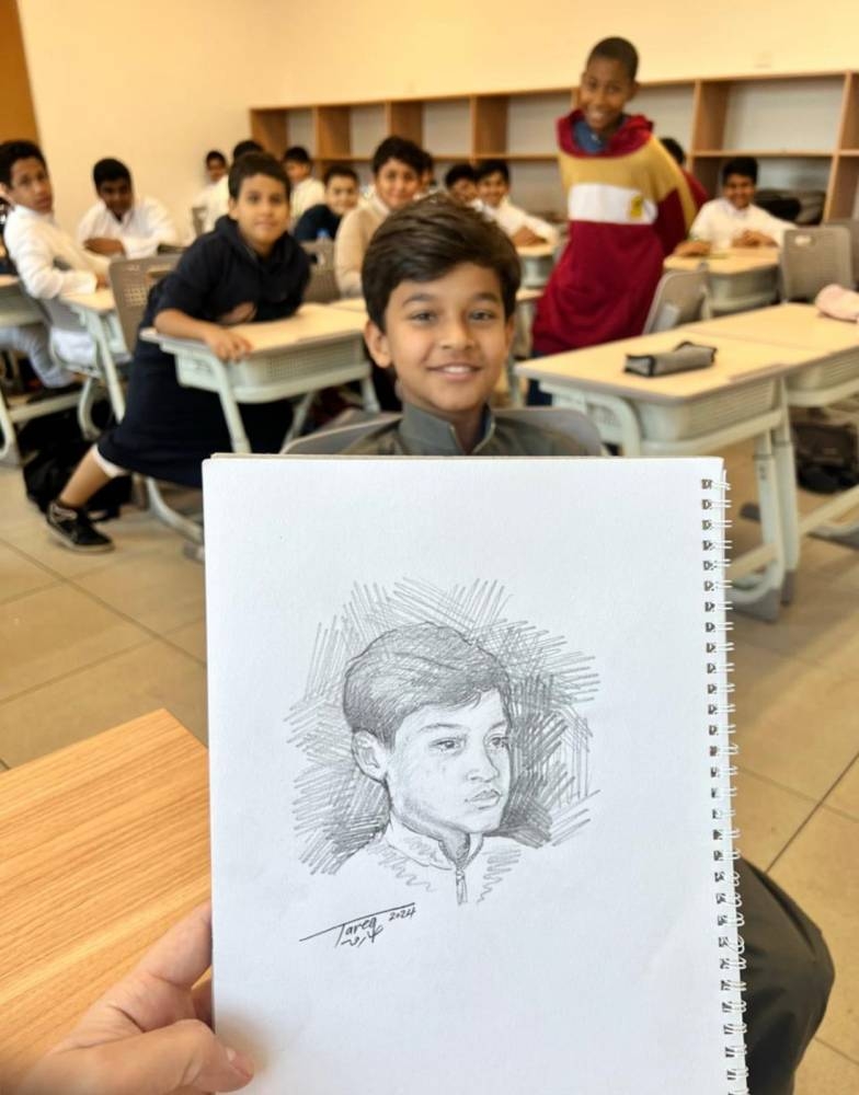 وفي جوٍ حافل بالألوان والأفكار، تتزاحم اللوحات مع ثقافة الطلاب داخل الحجرة الدراسية، ما يجعل من حصصه ورشة عمل حقيقية للإبداع.