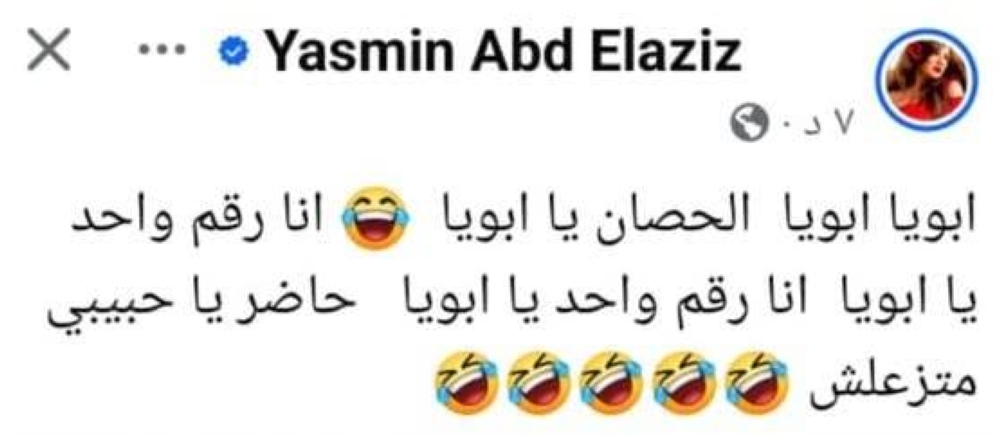 وبلهجة احتفالية، علّق العوضي: «الحمد لله.. فهد البطل يتربع على عرش المشاهدات، شكراً لجمهوري الغالي»، لكن الرد لم يتأخر، حيث فاجأت ياسمين متابعيها بمنشور عبر فيسبوك يحمل صورة من فيلم واسلاماه مع تعليق مقتضب ساخر قائلة: «أبويا أبويا الحصان يا أبويا.. أنا رقم واحد يا أبويا.. أنا رقم واحد يا أبويا.. حاضر يا حبيبي متزعلش، فيما اعتبر العديد من المعلقين أنها تلمح إلى زوجها السابق».