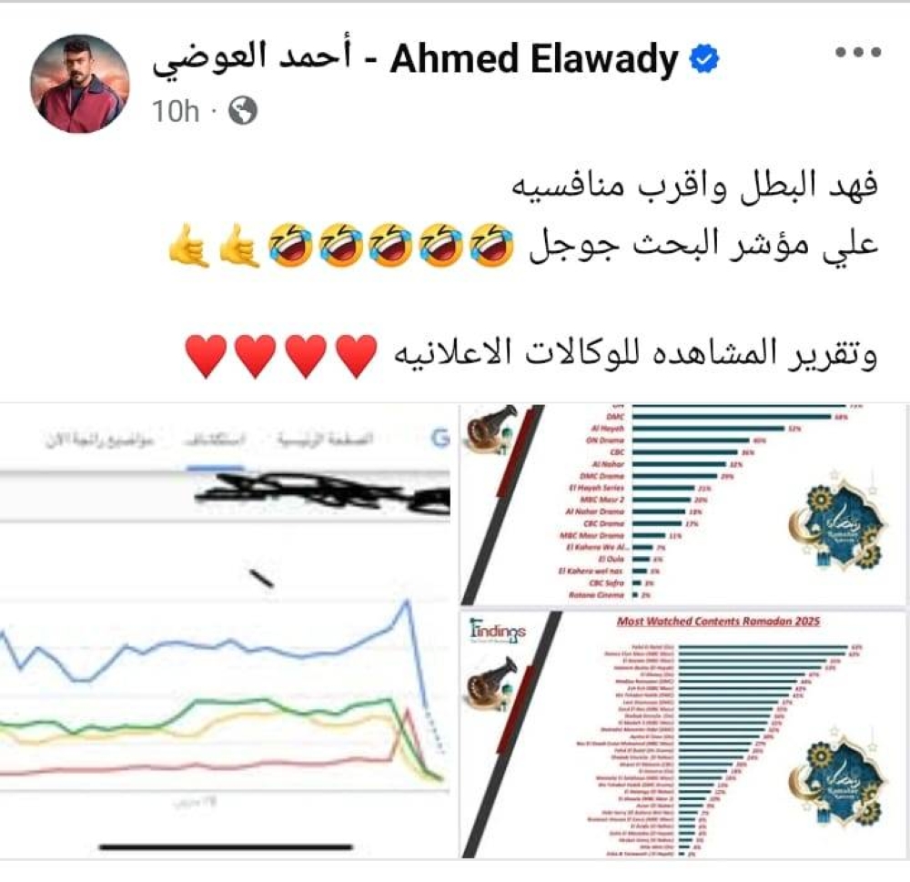 وكان «العوضي» قد نشر عبر صفحته الرسمية على فيسبوك صورة تُظهر ترتيب المسلسلات الأكثر مشاهدة عالمياً، حيث احتل «فهد البطل» المركز الأول، متفوقاً على مسلسل ياسمين عبدالعزيز «وتقابل حبيب» الذي جاء في المركز الثاني.