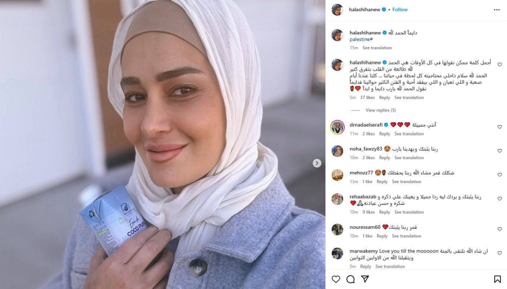 كما أكدت حلا شيحة من خلال تعليقاتها على المنشور، أن الجميع يتعرض لابتلاءات صعبة في الحياة ومنها الفتن وفقد الأحبة، إذ كتبت:«أجمل كلمة ممكن نقولها في كل الأوقات هي الحمد لله طالعة من القلب بتفرق كتير».