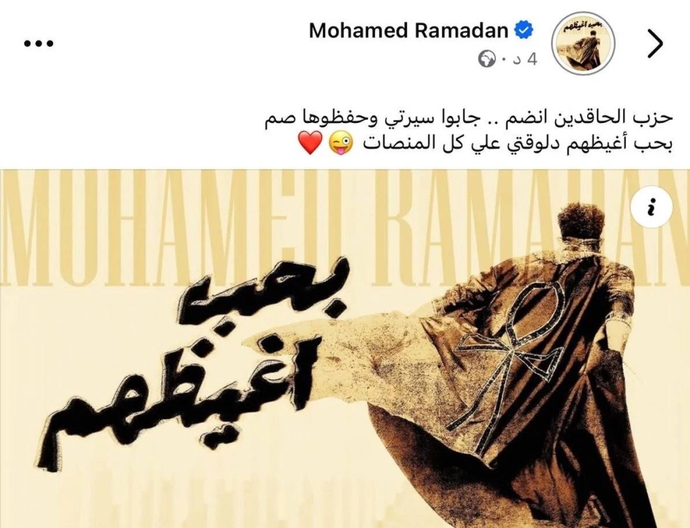 أطلق الفنان المصري محمد رمضان، أغنيته الجديد التي تحمل اسم «بحب أغيظهم»، موجهاً رسالة مباشرة كرد صريح وساخر على الانتقادات التي تعرض لها أخيراً بسبب إطلالته في مهرجان «كوتشيلا» بولاية كاليفورنيا الأمريكية، تلك الحفلة التي أصبحت حديث السوشيال ميديا.