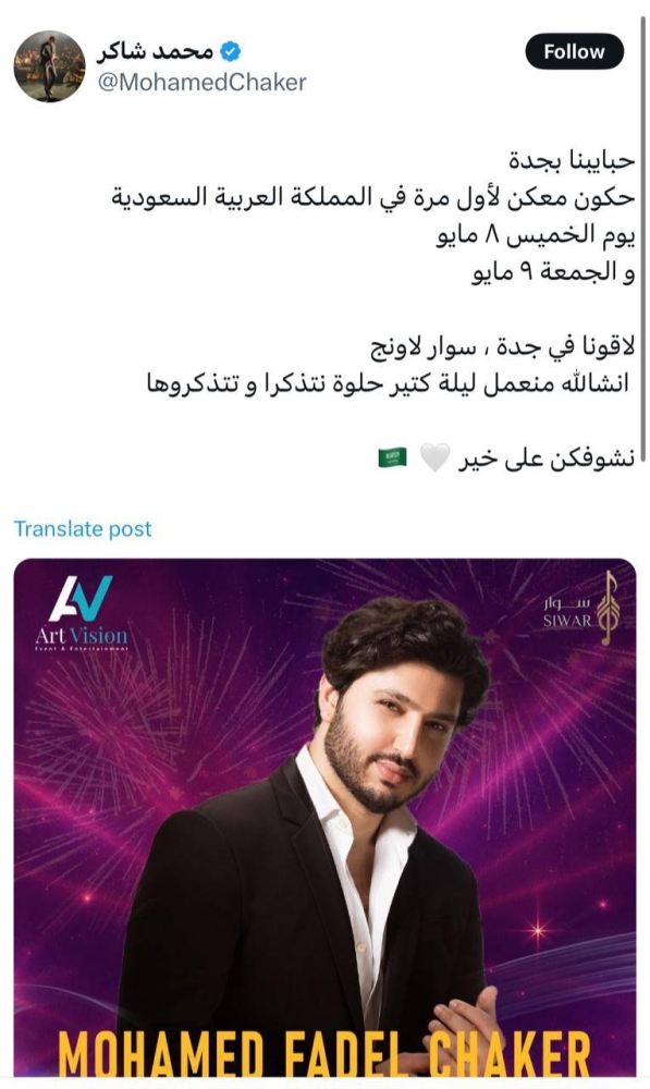 أعلن الفنان محمد شاكر نجل المطرب اللبناني فضل شاكر، عن إحيائه حفلين لأول مرة في المملكة العربية السعودية، ومن المقرر أن يُقاما يومَي 8 و9 مايو القادم، موجهاً الشكر لجمهوره في مدينة جدة.
