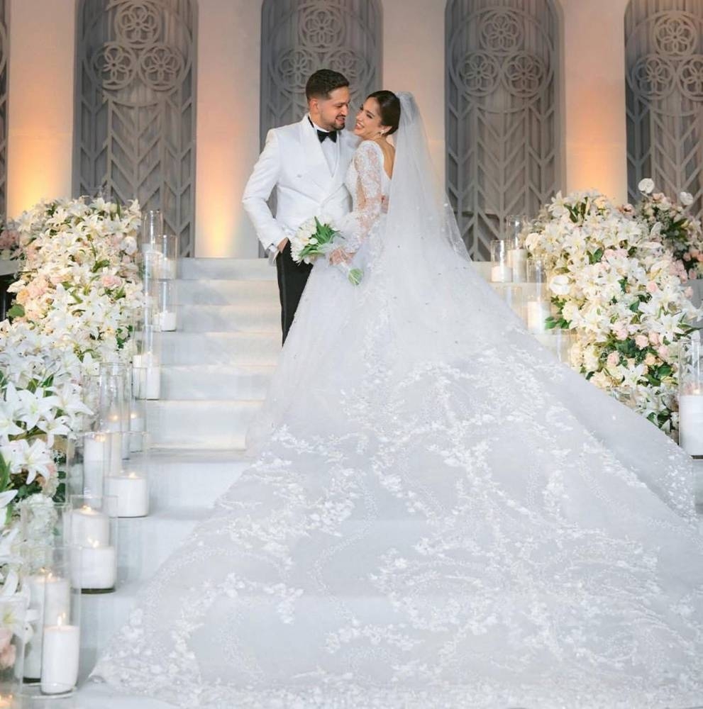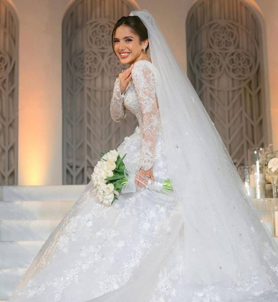 واختارت رنا رئيس الظهور بفستان زفاف ملكي باللون الأبيض بتصميم «منفوش»، ومزين بتطريزات ناعمة من الورود البيضاء وتفاصيل براقة، من توقيع المصمم هاني البحيري، يجمع بين الكلاسيكية والعصرية.