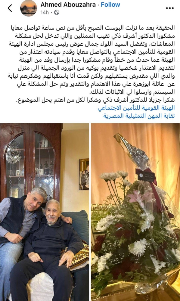 Ahmed concluded his remarks by stating that the crisis has been officially resolved, with proof of the situation being corrected, expressing gratitude to everyone who helped resolve the issue, saying: "Thank you very much to Dr. Ashraf Zaki and thank you to everyone who cared about resolving the matter, the National Social Insurance Authority and the Egyptian Actors' Syndicate."