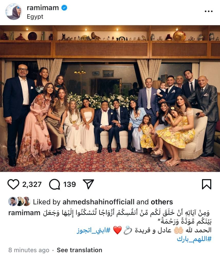 وكتب رامي تعليقاً على الصورة: (وَمِنْ آيَاتِهِ أَنْ خَلَقَ لَكُم مِّنْ أَنفُسِكُمْ أَزْوَاجًا لِّتَسْكُنُوا إِلَيْهَا)...«الحمد لله عادل وفريدة، ابني اتجوز».