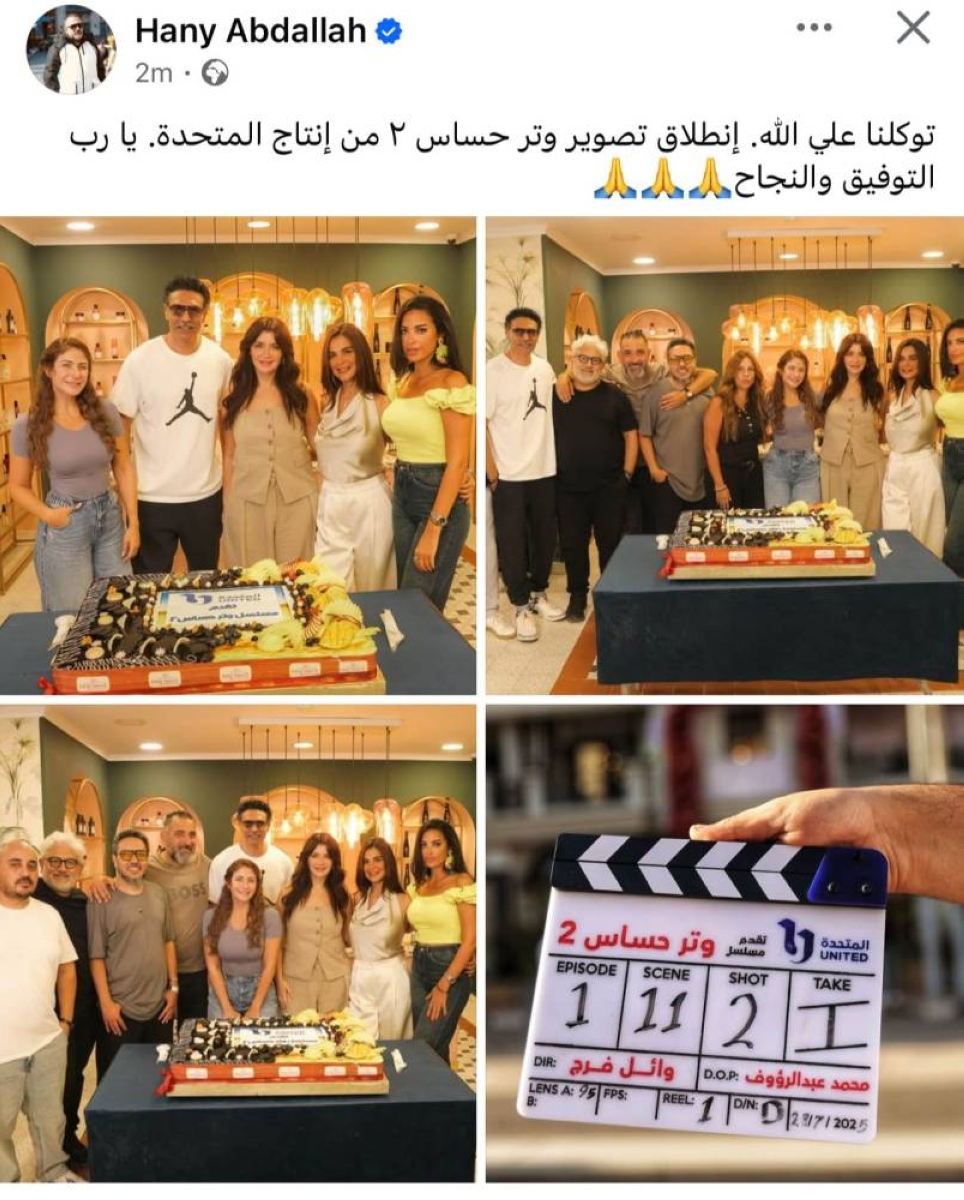 Hani Abdullah shared a series of photos on his personal account on the "Facebook" platform with the cast from the first day of filming, commenting: "We put our trust in God as we start filming Watir Hassas 2, produced by United.. May success and prosperity be with us."