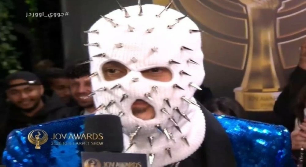 The Egyptian artist Ramiz Jalal caught attention with an unconventional look during his attendance at the Joy Awards ceremony in its sixth edition, as he wore a blue suit and concealed his facial features with a white mask adorned with protruding nails inspired by the singer "Tollit" mask.