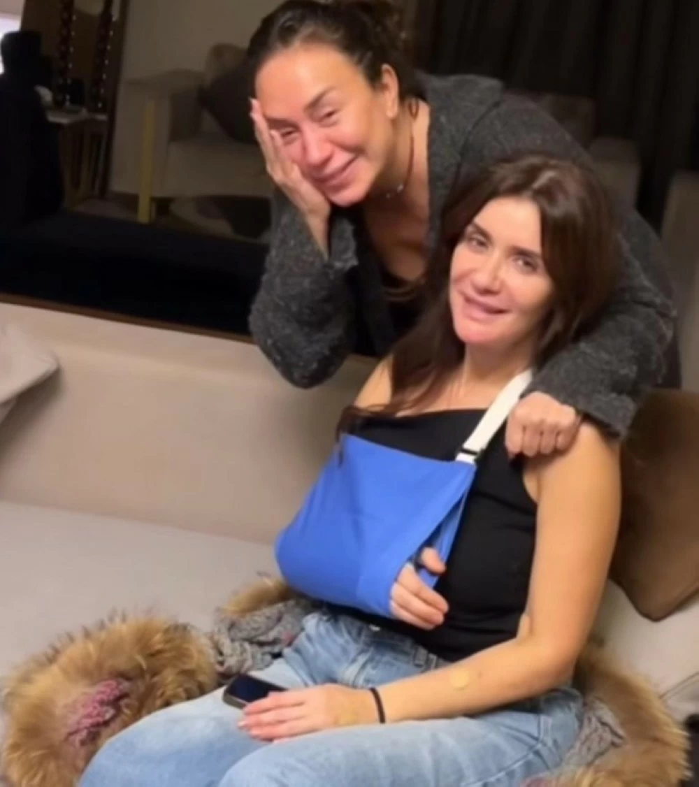 Engy posted a picture of herself with Ghada Adel, who appeared with her arm in a splint hanging from her chest, and commented: "Playing with dogs."