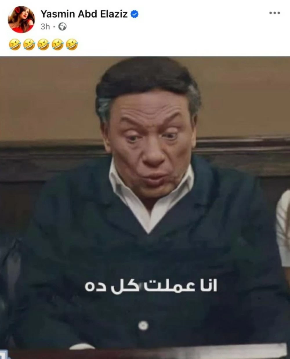 ونشرت عبر حسابها صورة للفنان عادل إمام من فيلم زهايمر، مرفقة بعبارة: «أنا عملت كل كده»، في إشارة ساخرة بدت وكأنها تعبر عن دهشتها من حجم الشائعات المتكررة حولها، دون الكشف عن تفاصيل محددة.