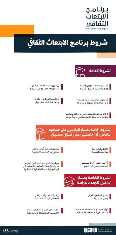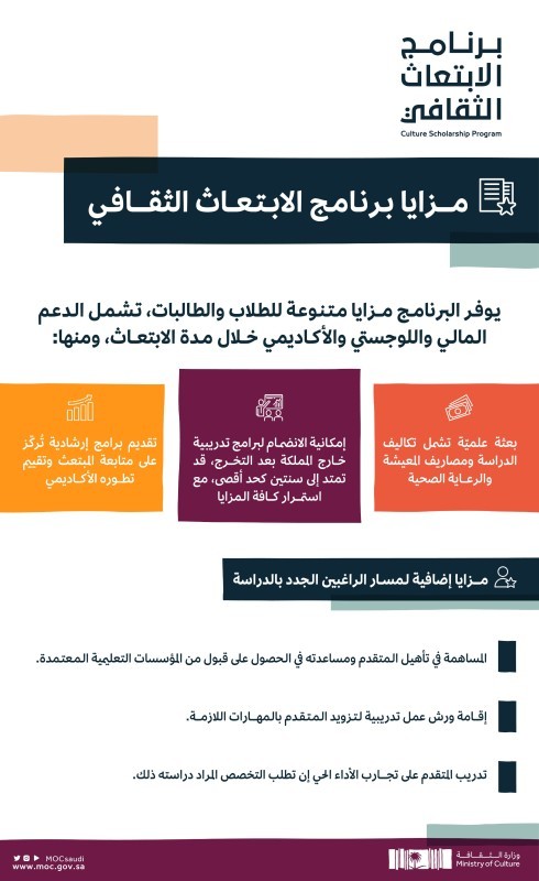 فتحت وزارة الثقافة باب تقديم طلبات الانضمام لبرنامج الابتعاث الثقافي أمام جميع الراغبين والراغبات في دراسة التخصصات الثقافية والفنية، ابتداءً من اليوم (الأحد) عبر المنصة الإلكترونية الخاصة ببرنامج الابتعاث الثقافي https://engage.moc.gov.sa/scholarships التي سيتم من خلالها استقبال جميع طلبات الانضمام إلى البرنامج، وذلك وفق ثلاثة مسارات، هي: مسار الدارسين على حسابهم الخاص، ومسار الحاصلين على قبول مسبَق، ومسار الراغبين الجدد بالدراسة، حيث تحتوي المنصة على استمارات وشروط ومزايا كل مسار.