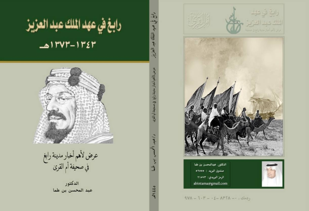 صدر حديثاً كتاب في تاريخ المملكة العربية السعودية للدكتور عبدالمحسن بن طما بعنوان «رابغ في عهد الملك عبدالعزيز: عرض لأهم أخبار مدينة رابغ في صحيفة أم القرى 1343- 1373هـ».