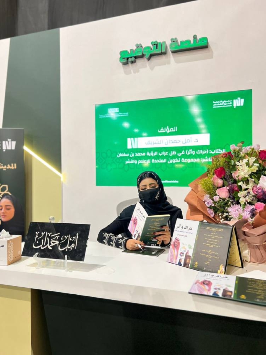 On a night in the city illuminated by knowledge, the International Book Fair in Madinah celebrated the launch of the book "Movement and Impact – Under the Patronage of Visionary Mohammed bin Salman" by Dr. Amal bint Hamdan, a media figure and writer who dedicated her pen to documenting the features of national transformation, as part of the activities of the Saudi Author Corner under the supervision of the Literature, Publishing, and Translation Commission.
