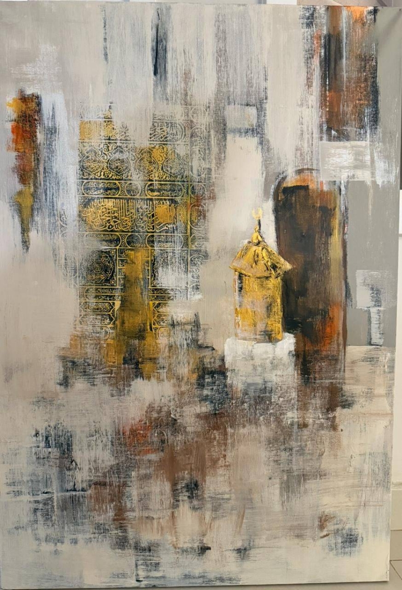 The visual artist Abdullah Munir Al-Quthami embodies in this painting a spiritual scene from the Holy Mosque in Mecca using an abstract expressionist style, blending the warmth of golden and gray colors with tonal gradations that give the work a temporal and spiritual dimension. The features of the Kaaba's covering intertwine with its gilded Arabic lines and the Station of Ibrahim, in an artistic treatment that balances between heritage details and free expression, making the painting an emotional state more than a direct depiction.