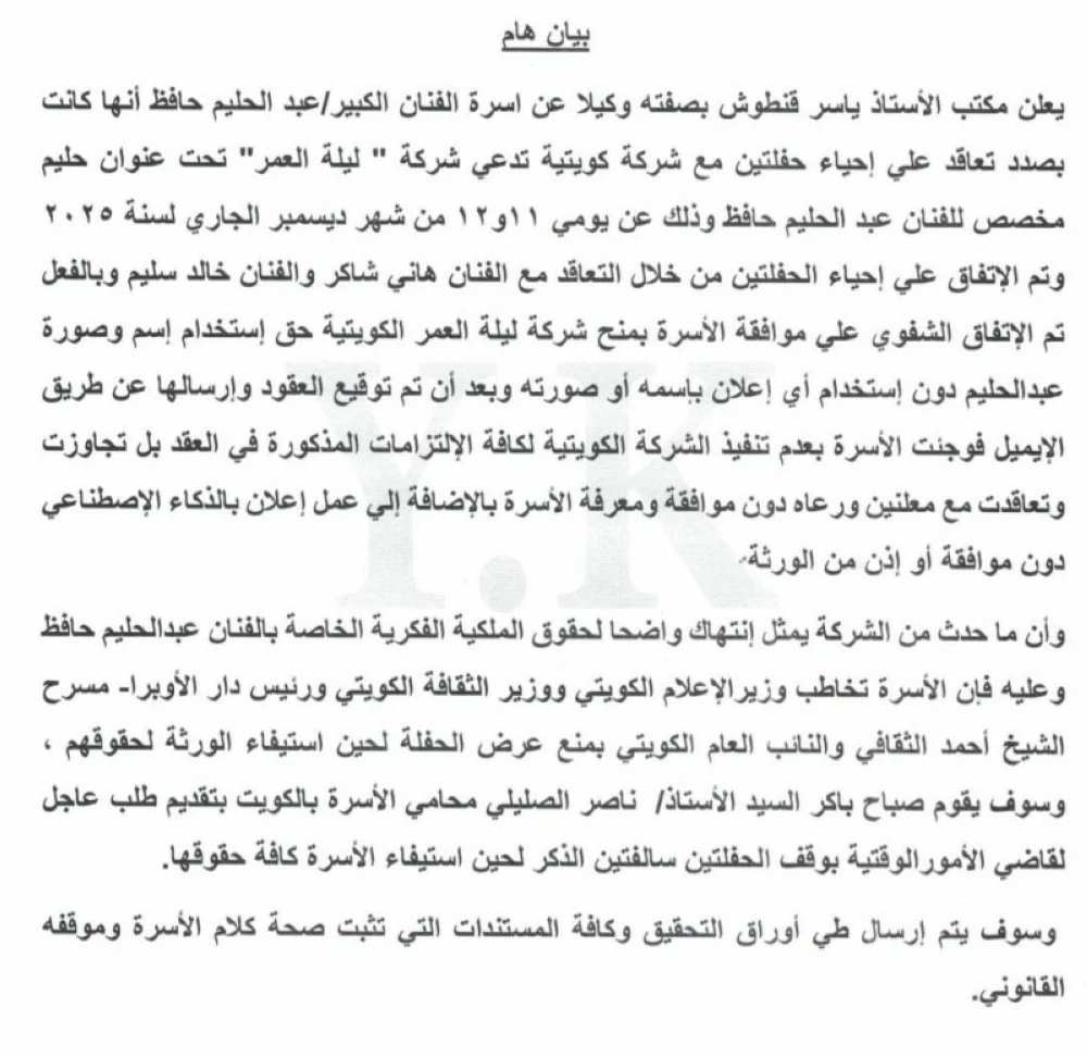 The statement confirmed that contracting with the artists does not grant the company the right to use the name or image of Abdel Halim Hafez, emphasizing that the family has not signed any authorization allowing the exploitation of the late artist's heritage or intellectual rights.