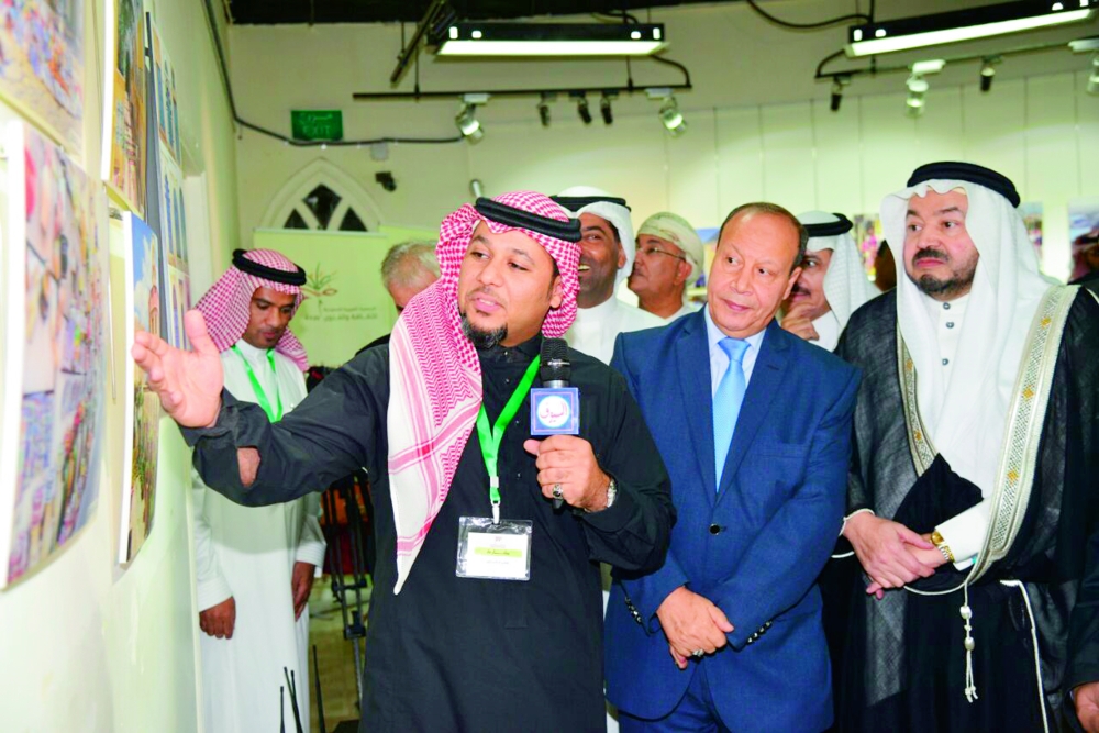 الفوتوغرافي هاني أبو الجدايل مع أعماله في المعرض أمس الأول. (عكاظ)