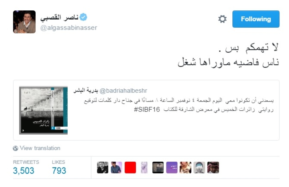 على غرار أسلوبه الكوميدي الساخر وقفشاته المعتادة منه، أعاد الفنان ناصر القصبي تغريدة زوجته بدرية البشر، التي أعلنت فيها عن تدشين روايتها الجديدة "زائرات الخميس"، مغرداً بسخرية: "لا تهمكم بس، ناس فاضية ما وراها شغل".