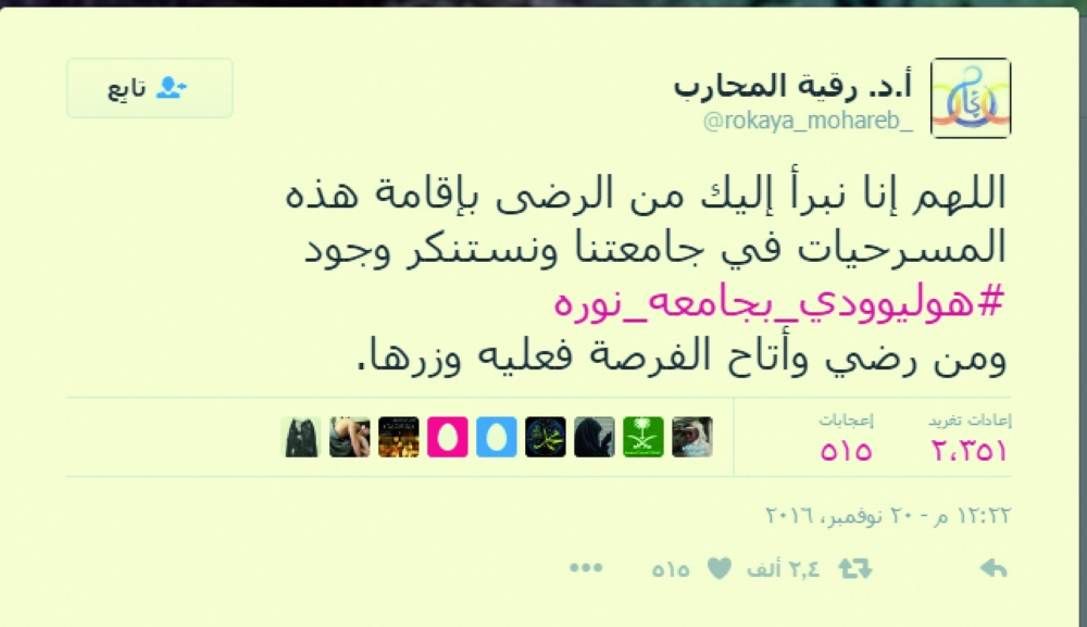 وقالت أستاذ مساعد تخصص العقيدة والمذاهب المعاصرة في الجامعة الدكتورة هيلة اليوسف، في تغريدة على حسابها في «تويتر»: «من المؤسف والمحزن أن تكون فعاليات هيئة الترفيه مقامة في حرم جامعي مقام لنشر العلم!». وأضافت: «العاقل لا يرفض الترفيه بل يقبله على أن يكون بناء قيم مباح وفي أماكن مقامة ومخصصة له، لا في محضن مقام ليكون منارة علم ومعرفة». فيما ذهبت عضو هيئة التدريس في الجامعة الدكتورة أفراح الحميضي إلى القول: «جامعتنا وأحب من سُميت باسمها، أحسب لو كانت على قيد الحياة رحمها الله، لأوسعت هؤلاء المهرجين ضربا؛ فليس مكانكم ساحات الثقافة ومدرجات العلم». وتبرأت أستاذة الحديث بالجامعة الدكتورة رقية المحارب، من إعلان إقامة العرض المسرحي بقولها: «اللهم إنا نبرأ إليك من الرضى بإقامة هذه المسرحيات في جامعتنا ونستنكر وجودها». بينما استهجن المغرد مشهور الديبان الحملة المؤدلجة ضد الجامعة، إذ ناشد هيئة الترفيه بعدم الإنصات لهم. واستنكر حماد الشمري تناقضهم ما أسماه بـ«الصياح والنياح» على عرض مسرحي.